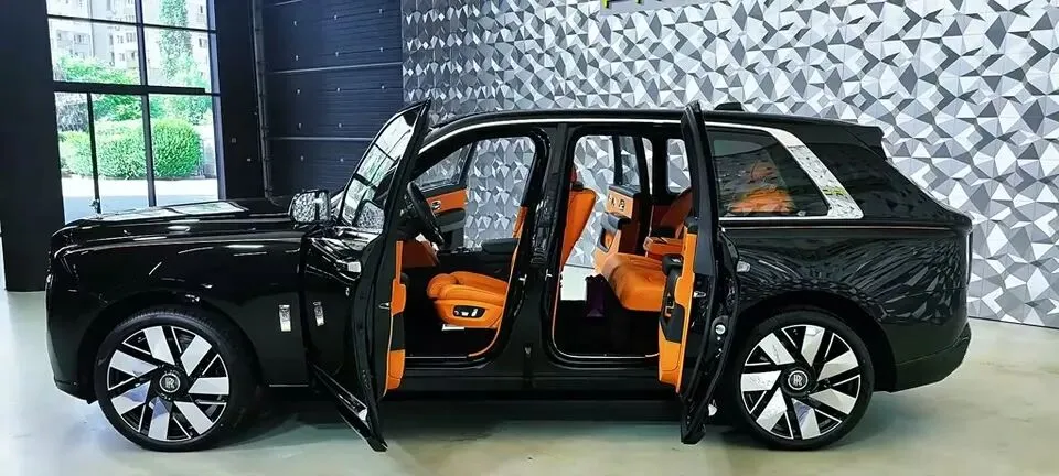 库里南对开门全开状态,展示奢华的橙色顶级真皮座舱。