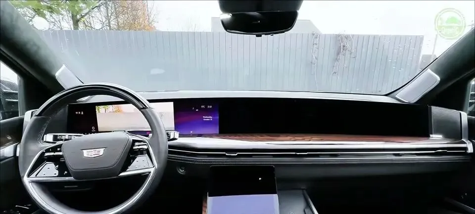 凯雷德前排内饰,展示美式豪华风格与大尺寸液晶屏。