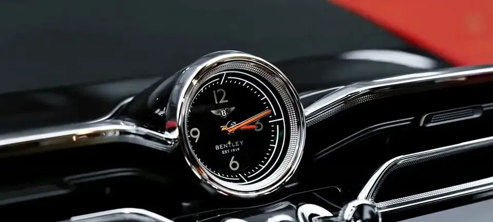 添越内饰细节特写,展示标志性的百年灵车载时钟。