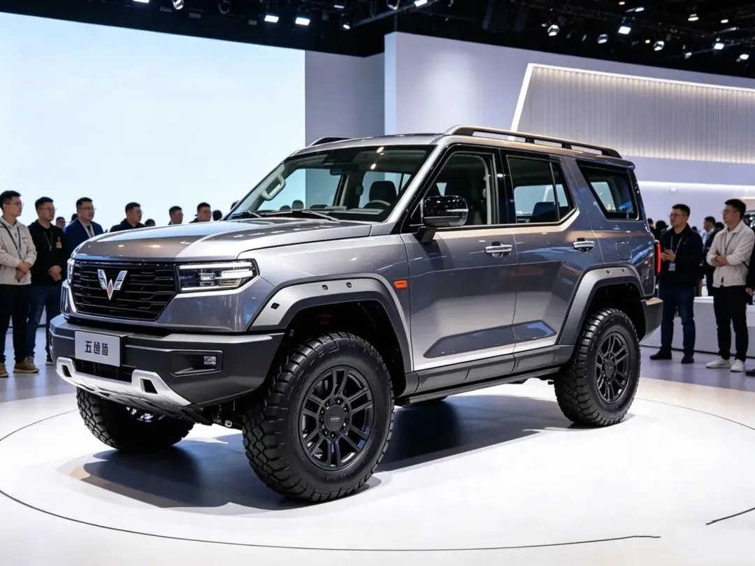 五菱硬派越野SUV,哑光灰车身,方正硬朗造型;非承载式车身+越野胎,机械仪表盘+悬浮中控,硬派实用.