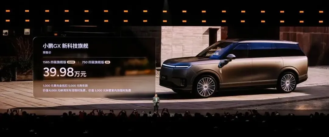 今日,小鹏汽车首款全尺寸旗舰SUV—— 小鹏GX重磅亮相并正式开启预售,新车带来纯电和超级增程两个版本,预售价39.98万元。小鹏GX纯电版四驱纯电续航高达750km;超级增程版纯电续航430km,综合续航1585km。即日起至小鹏GX上市日,用户可享预订限时权益:1000元意向金抵扣5000元购车款,价值6000元的峡湾灰车漆、价值3000元的林雾紫内饰限时免费。